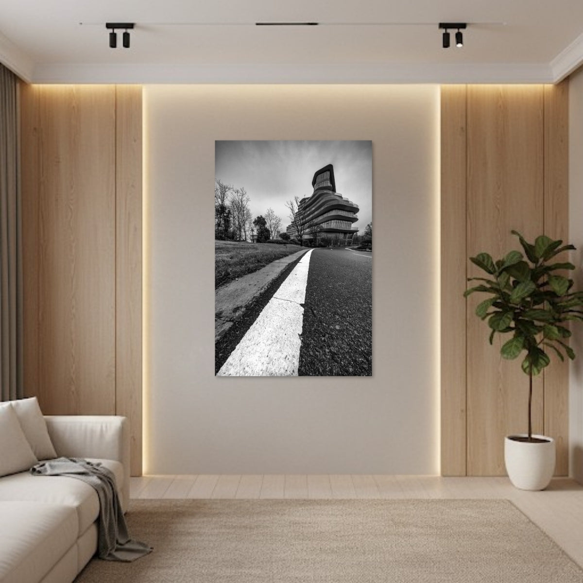 El Dibond en aluminio cepillado proporciona una estética industrial y precisa. La impresión se realiza sobre una superficie metálica con vetas lineales que se perciben sutilmente en las áreas claras de la imagen, aportando un carácter distintivo sin distraer del contenido. Es un material rígido, ligero y resistente, con un acabado mate que evita reflejos y mantiene una apariencia sobria. Funciona bien en fotografía contemporánea, arquitectura y composiciones de tonos neutros o en blanco y negro.