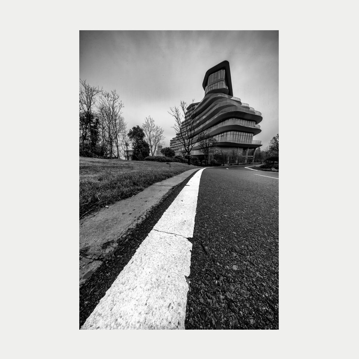 En una Visita a uno de los Proyectos de MAD Arq en china, tome esta imagen de uno de sus edificios Emblematicos , señslizado por la linea del pavimento.