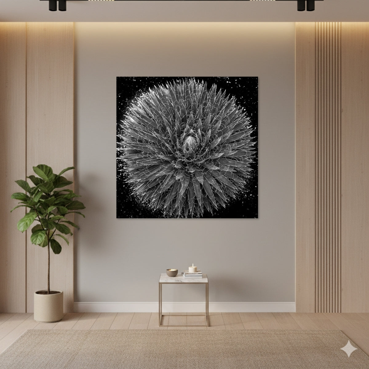 El Dibond en aluminio cepillado proporciona una estética industrial y precisa. La impresión se realiza sobre una superficie metálica con vetas lineales que se perciben sutilmente en las áreas claras de la imagen, aportando un carácter distintivo sin distraer del contenido. Es un material rígido, ligero y resistente, con un acabado mate que evita reflejos y mantiene una apariencia sobria. Funciona bien en fotografía contemporánea, arquitectura y composiciones de tonos neutros o en blanco y negro.